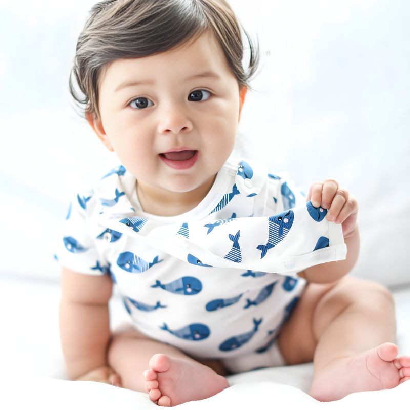 Designed with love and care, this set is free from harsh dyes and chemicals, ensuring your baby’s safety. The breathable fabric keeps your baby comfortable, while the charming whale print adds a cheerful and stylish touch. Whether for nap time, playtime, or outings, this set keeps your baby looking adorable and feeling great.