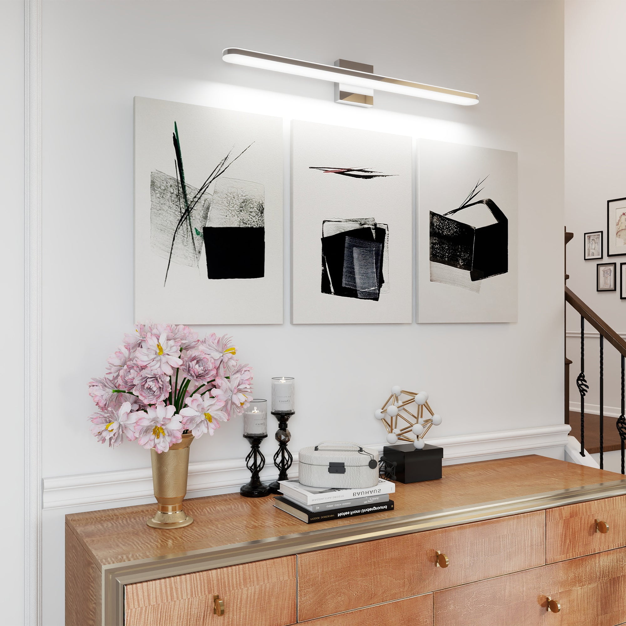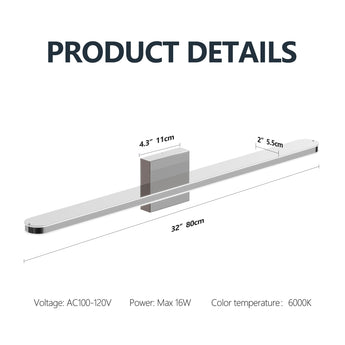 2.MODERN VANITY LAMPS: With a power of 16W and a size of 32 inches. The natural white color temperature of 6000K creates a softer light color, creating a comfortable and inviting atmosphere in your bathroom 3.HIGH-QUALITY CONSTRUCTION: The chrome dimmable bathroom wall light features a stainless steel frame and acrylic shade. Polished Chrome Stainless Steel Frame is dust-proof, fog-proof, anti-corrosion and water-proof. Frosted White Solid Acrylic Lampshade provides excellent down lighting without glare. This high-quality construction allows the chrome bath light fixture to maintain its sleek appearance over time 4.WIDE APPLICATION: This contemporary restroom light fixture is not only perfect for bathroom lighting but also ideal for makeup application. The Light for mirror in bathroom is suitable for various locations including toilets, restrooms, bathrooms, bedrooms, powder room, living room, hallway wall, vanity cabinet, mirror cabinets, etc